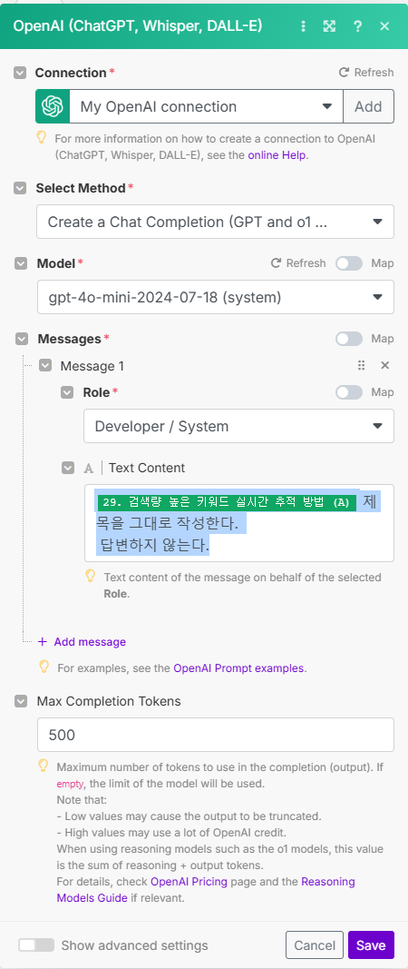 4. GPT 제목 모듈 지침 (Create a Completion (Prompt) (GPT and o1, o3 Models)