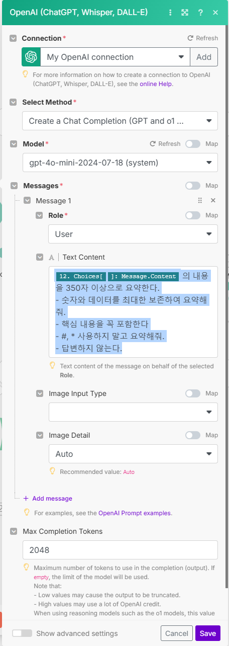 {{12.choices[].message.content}} 의 내용을 350자 이상으로 요약한다.