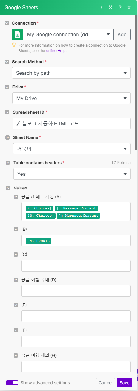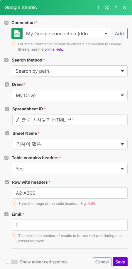 1. Google Sheets (Watch New Rows) 모듈 지침