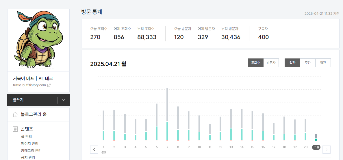 티스토리의 콘텐츠 업로드와 검색 최적화 전략이 맞아떨어지며 꾸준히 성장 중인 모습입니다.