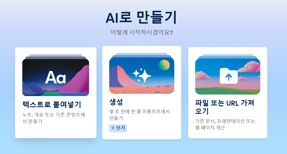 감마의 '생성' 버튼은 AI가 빈곳을 채워주는 기능을 합니다.
