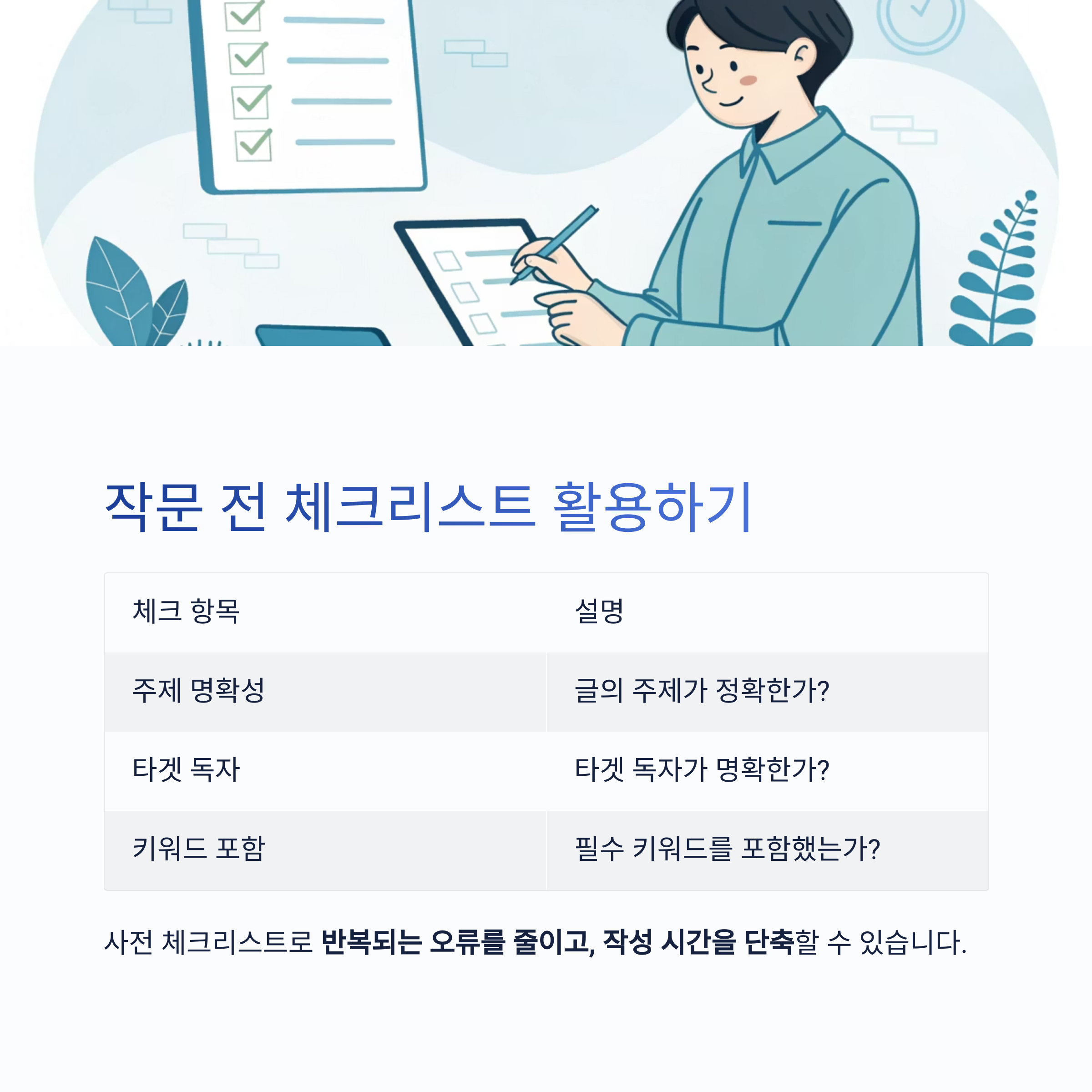 이렇게 사전 체크리스트를 통해 반복되는 오류를 줄이고, 작성 시간을 단축할 수 있습니다.