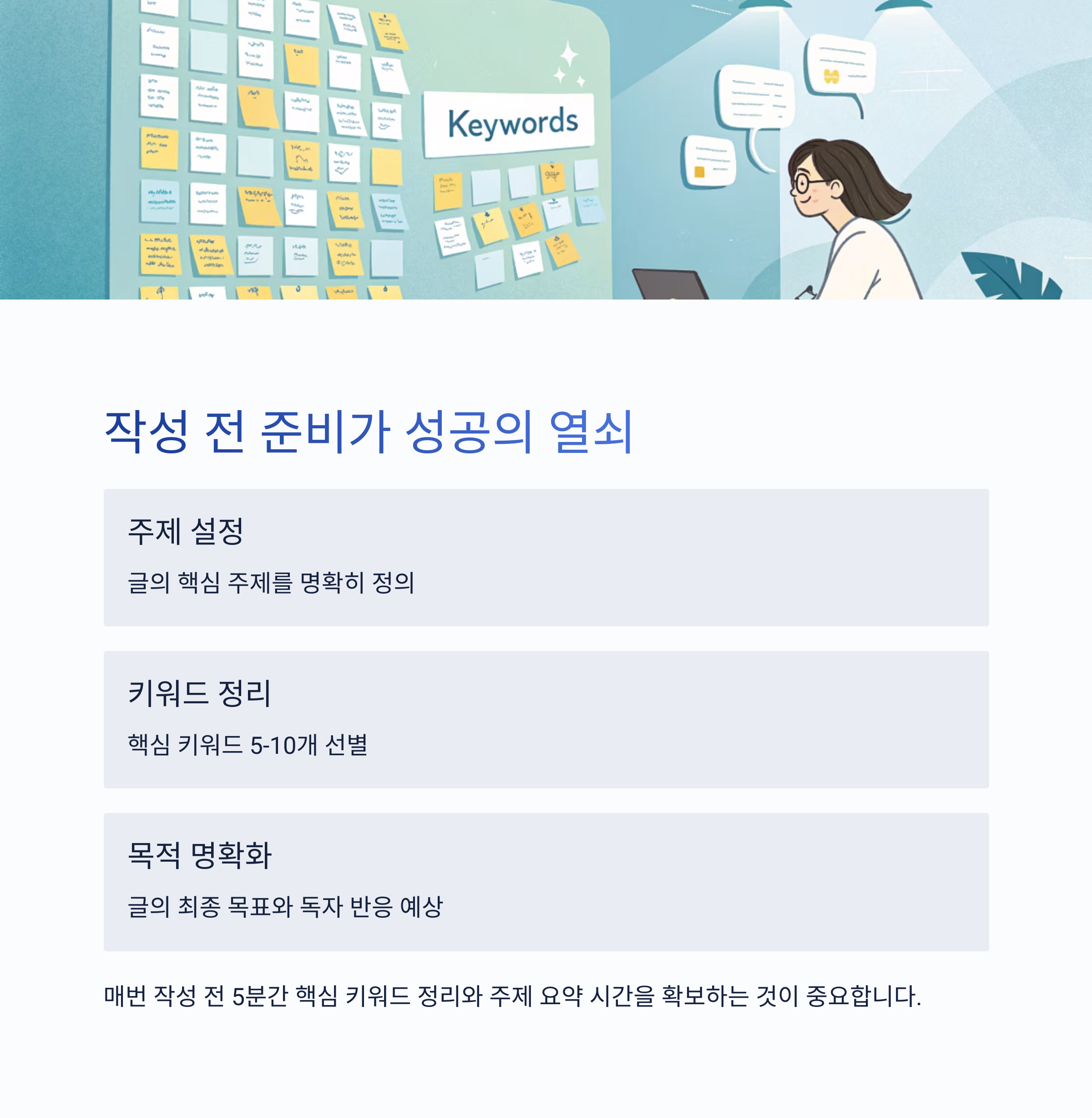 따라서 매번 작성 전 5분간 핵심 키워드 정리와 주제 요약 시간을 확보하는 것이 중요합니다.