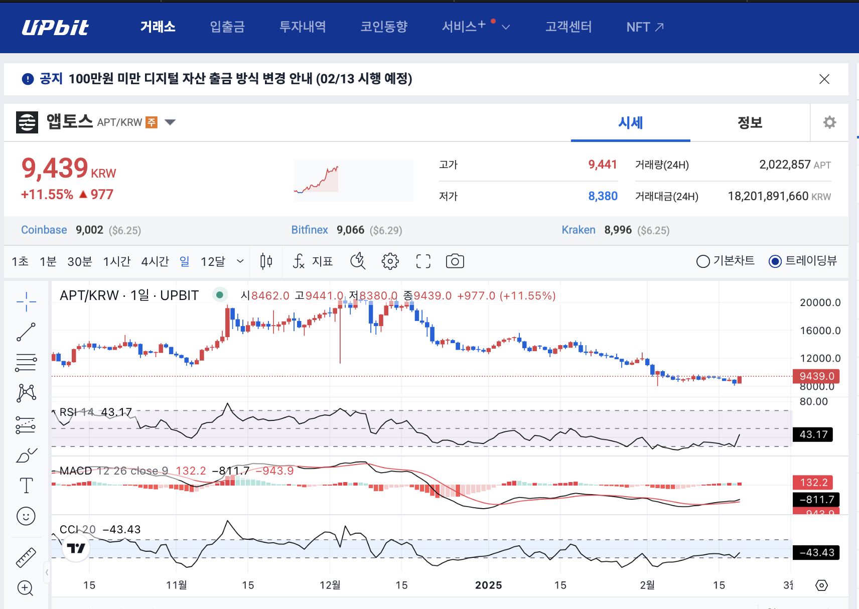 앱토스(APT)의 최근 가격 움직임을 살펴보면 하락 추세 속에서 9,000원 부근에서 반등을 시도하고 있습니다. 일봉 기준 RSI(42.50)는 과매도 구간까지는 내려가지 않았지만, 이전 저점 대비 상승하며 회복의 조짐을 보이고 있습니다. MACD(128.4) 또한 신호선과의 간격을 좁히며 상승 다이버전스를 형성하려는 모습이 관찰됩니다. CCI 지표는 -45.73으로 아직 확실한 매수 신호는 아니지만, 추가 상승 시 긍정적인 흐름이 나올 가능성이 있습니다.