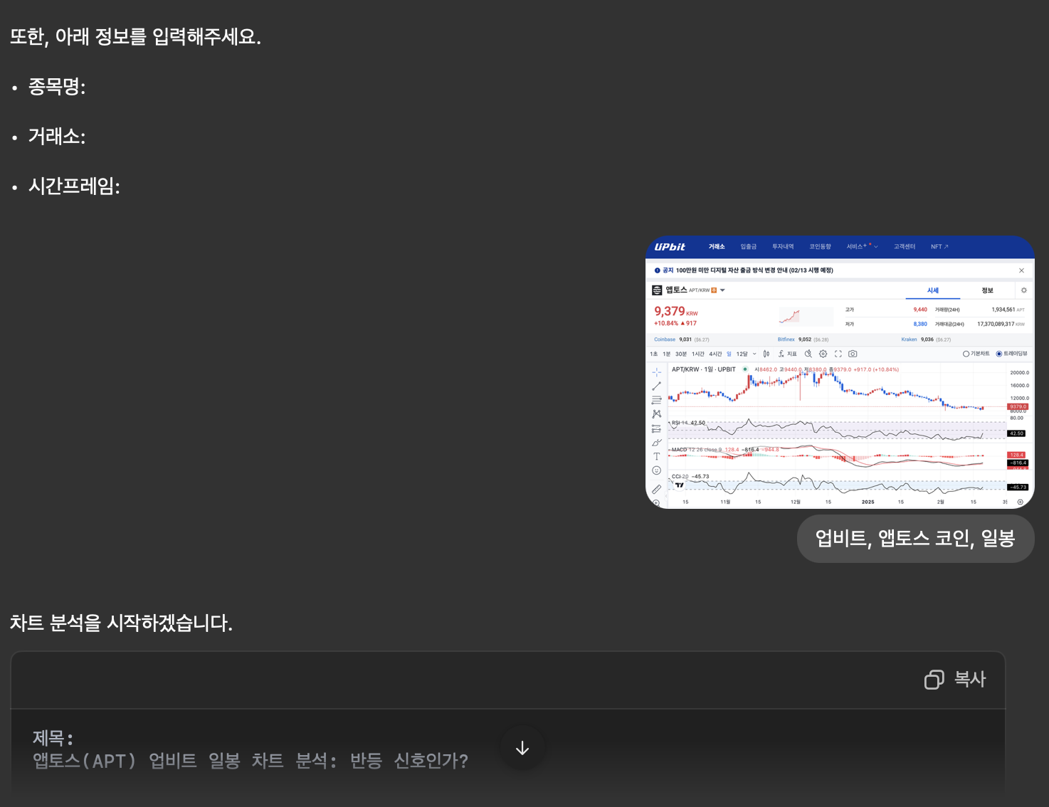 앱토스는 최근 10% 이상 상승하며 단기 반등을 시도하고 있지만, 아직 확실한 상승 추세 전환이라고 보기는 어렵습니다. 거래량이 늘어나고 있으나, 9,500원 저항선을 돌파해야 본격적인 상승세로 전환될 가능성이 높습니다.