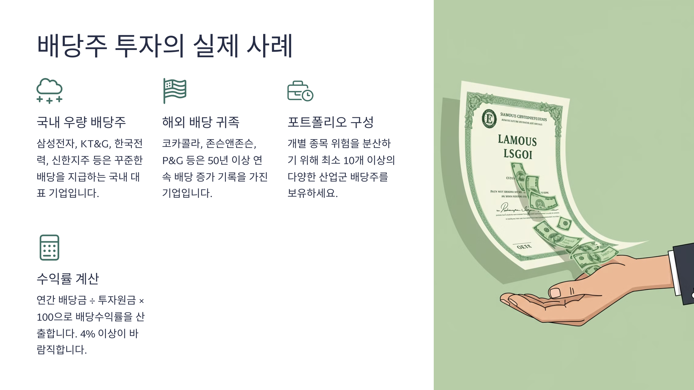 배당 성향, 배당 성장률, 재무 건전성을 고려하여 투자하는 것이 안정적인 현금 흐름을 확보하는 핵심이다.