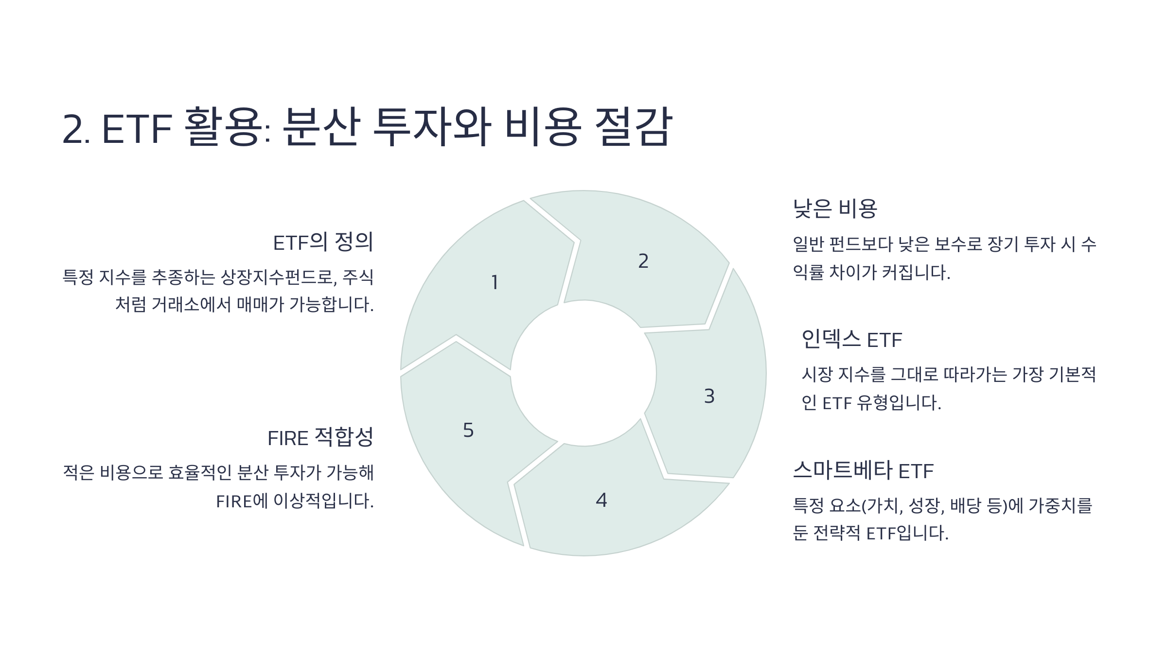 FIRE를 위한 ETF 투자는 장기적인 시각에서 진행하는 것이 중요하다. 대표적인 ETF로는 S&P 500을 추종하는 ETF, 고배당 ETF, 채권 ETF 등이 있다.