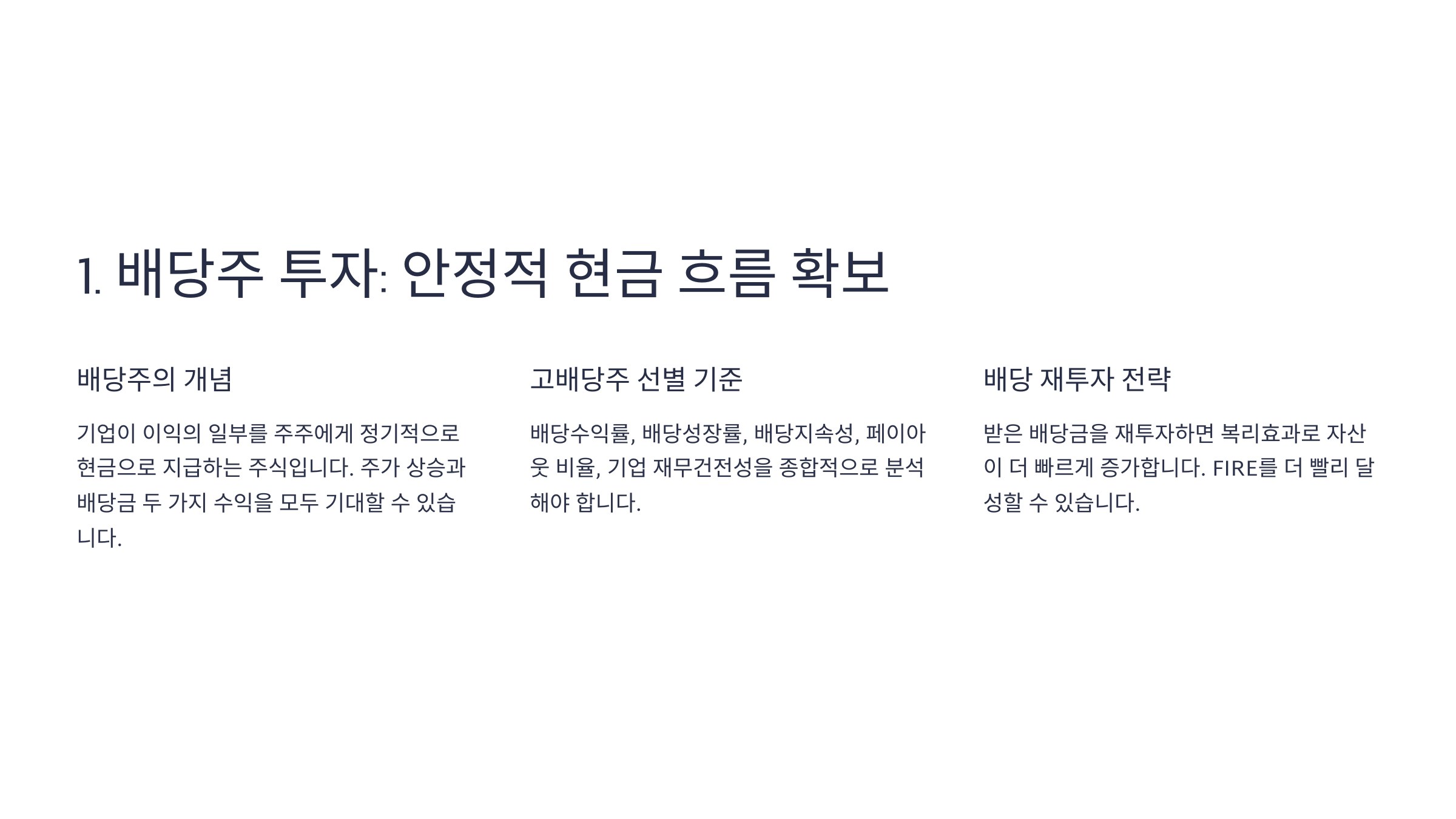 FIRE를 목표로 하는 투자자에게 배당주는 매우 매력적인 자산이다. 배당금은 꾸준한 현금 흐름을 만들어 주기 때문에 일정한 소득원이 될 수 있다.