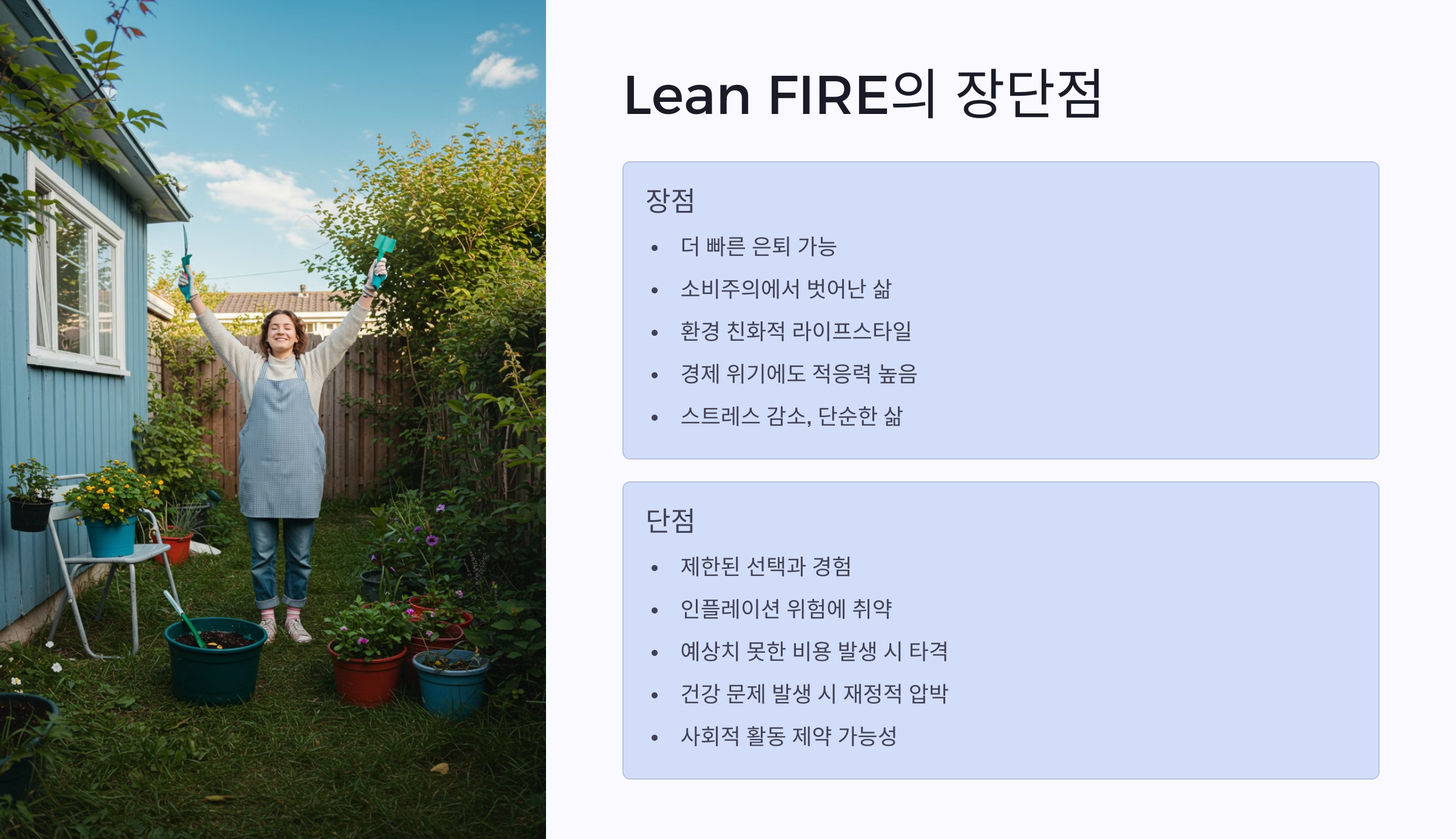 - Lean FIRE: 예상치 못한 지출 발생 시 리스크 큼