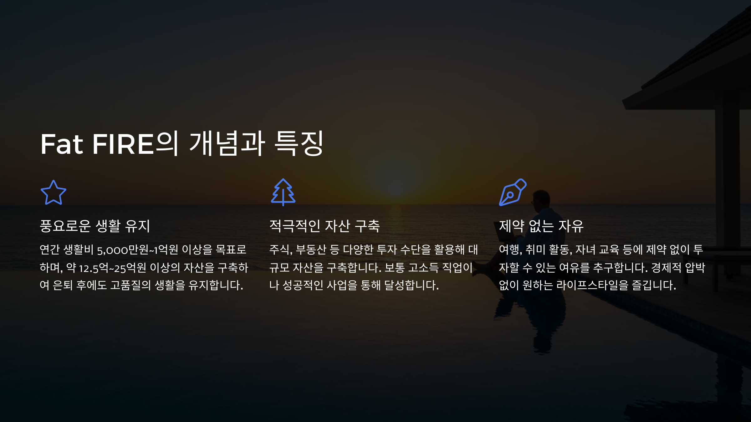 - Fat FIRE: 최소 10억 원 이상 필요