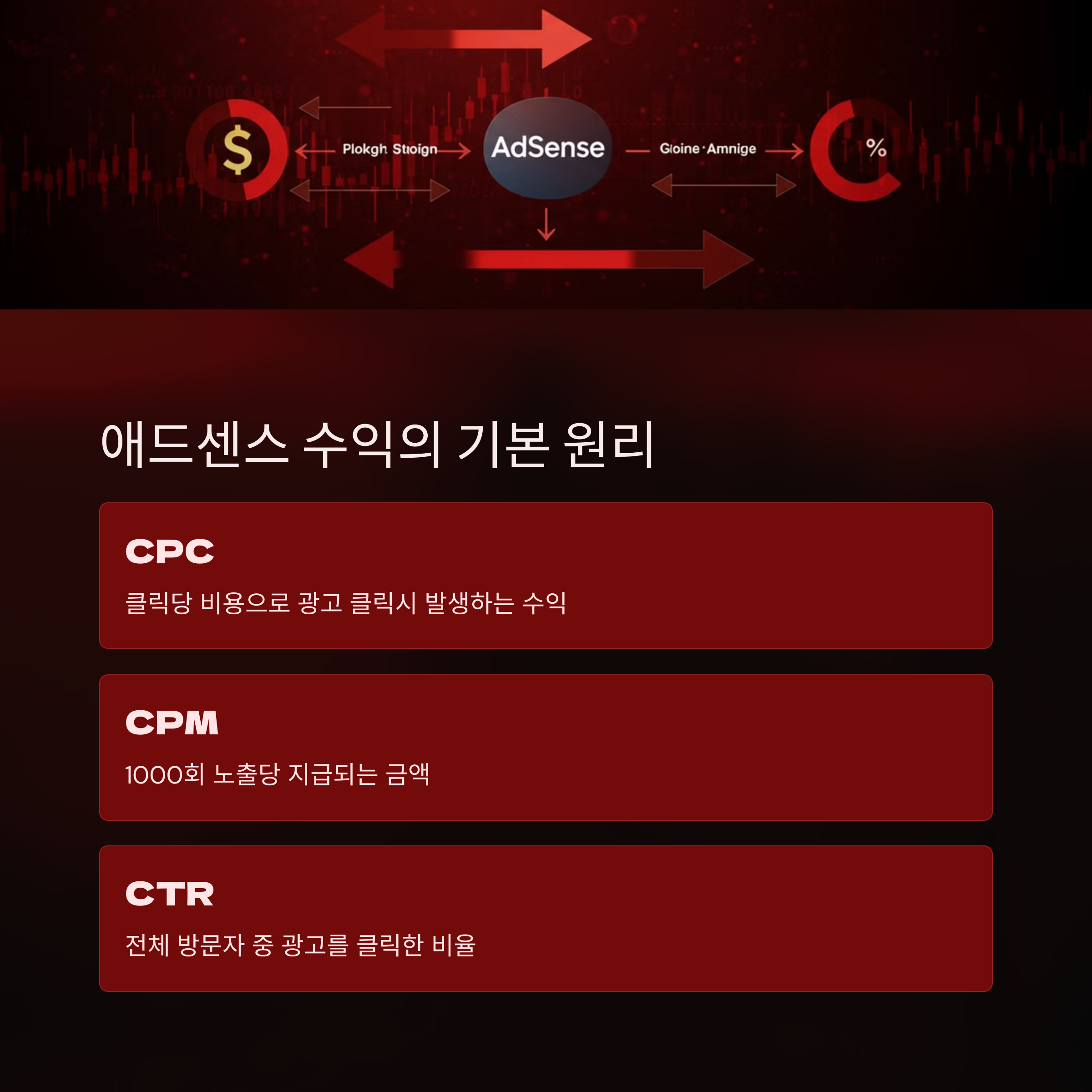 | 애드센스 수익 구조 | 광고 클릭당 수익(CPC), 노출당 수익(CPM), 클릭률(CTR)이 핵심입니다. |