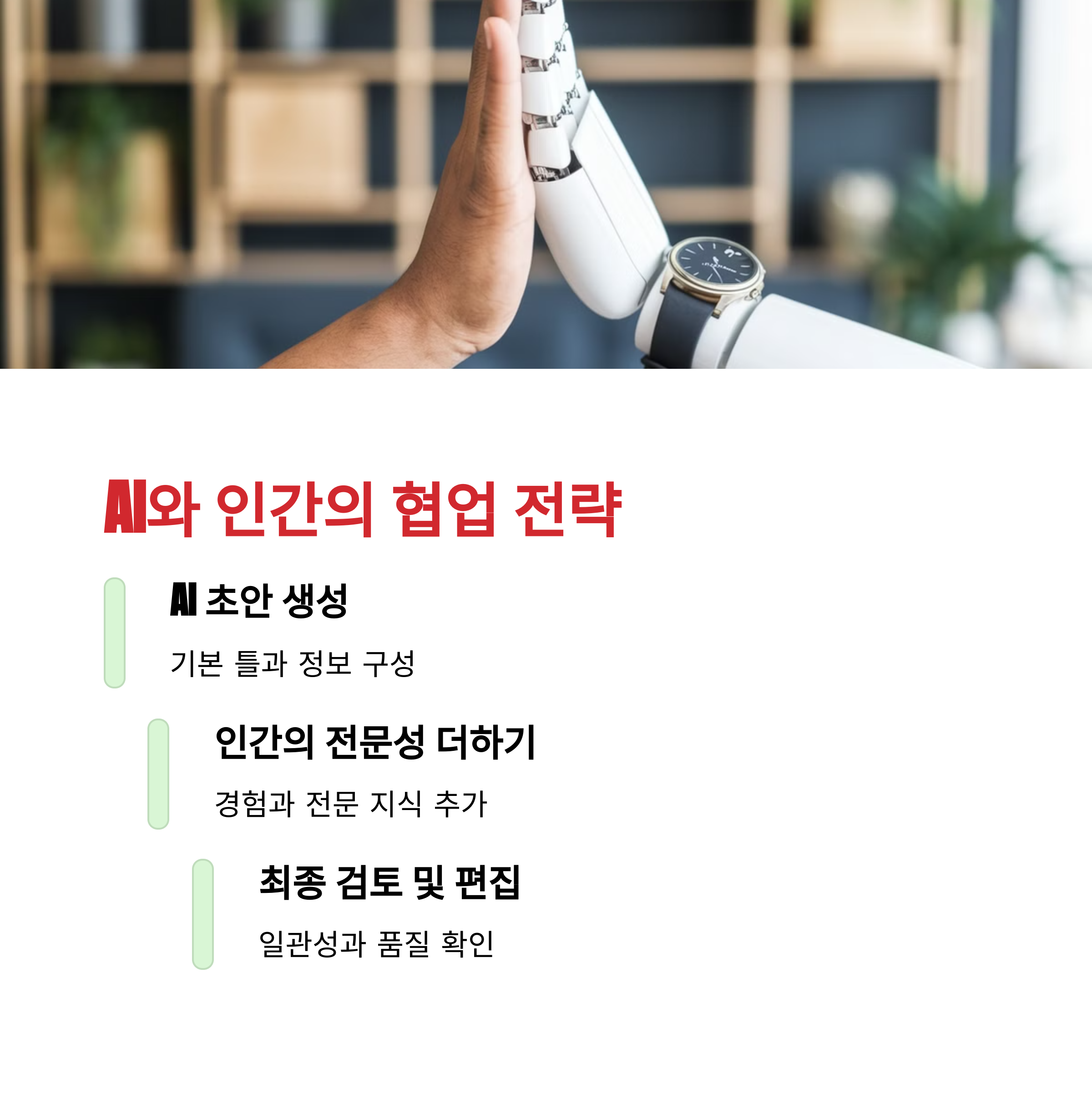 가독성과 신뢰도를 높이기 위해 AI와 인간이 협업하는 것이 필수적입니다. AI가 초안을 제공하고, 사람이 편집과 최적화를 담당하는 방식이 가장 효과적입니다.