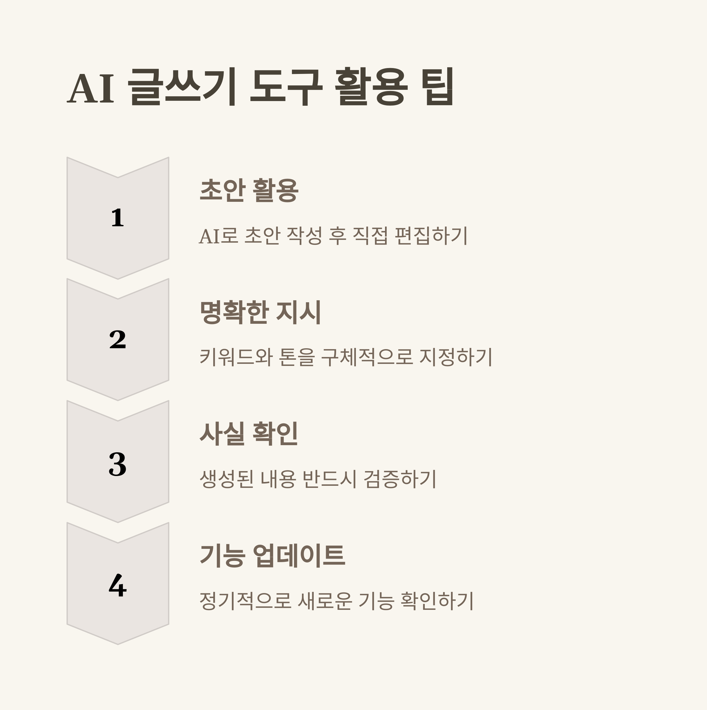 AI 글쓰기 도구는 효율성을 높이지만, 사람의 검토와 수정이 반드시 필요합니다. SEO 최적화, 브랜드 맞춤형 글쓰기 등은 여전히 사람이 조정해야 합니다. 따라서 AI를 보조 도구로 활용하는 것이 가장 좋은 방법입니다.