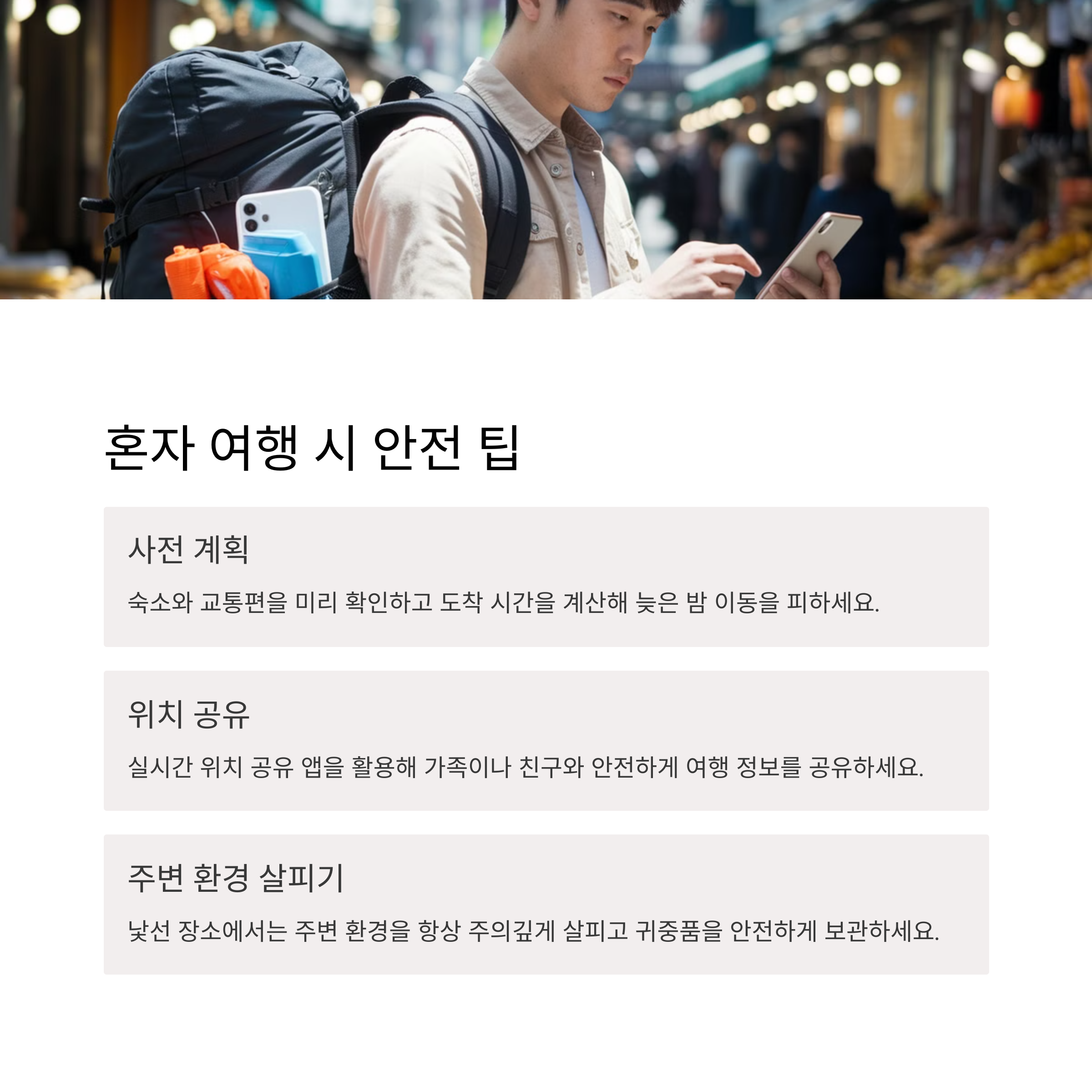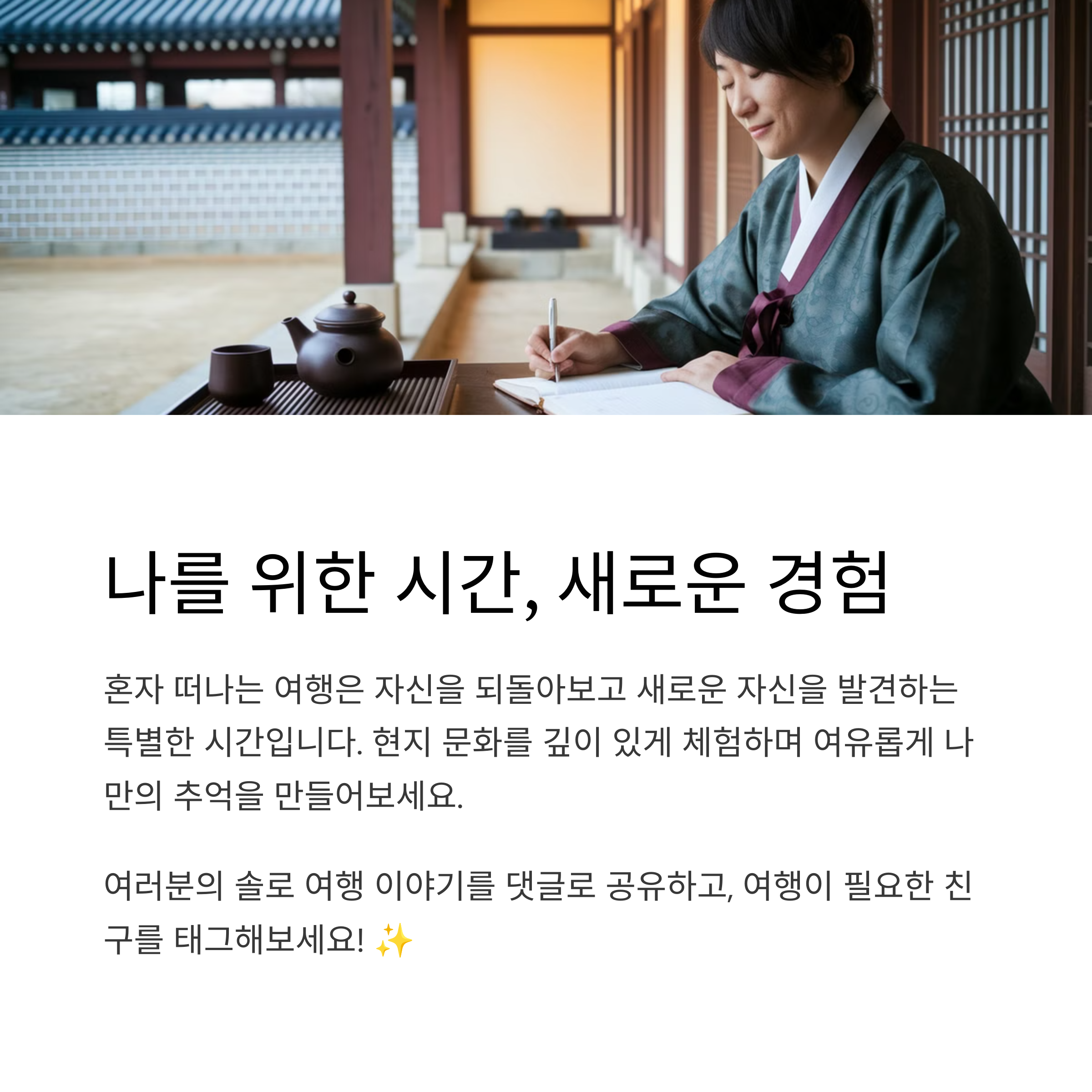 혹시 혼자 여행을 다녀온 경험이 있으신가요? 추천하고 싶은 여행지가 있다면 댓글로 공유해 주세요! 많은 분들과 정보를 나누며 더욱 알찬 여행을 계획해 봅시다.