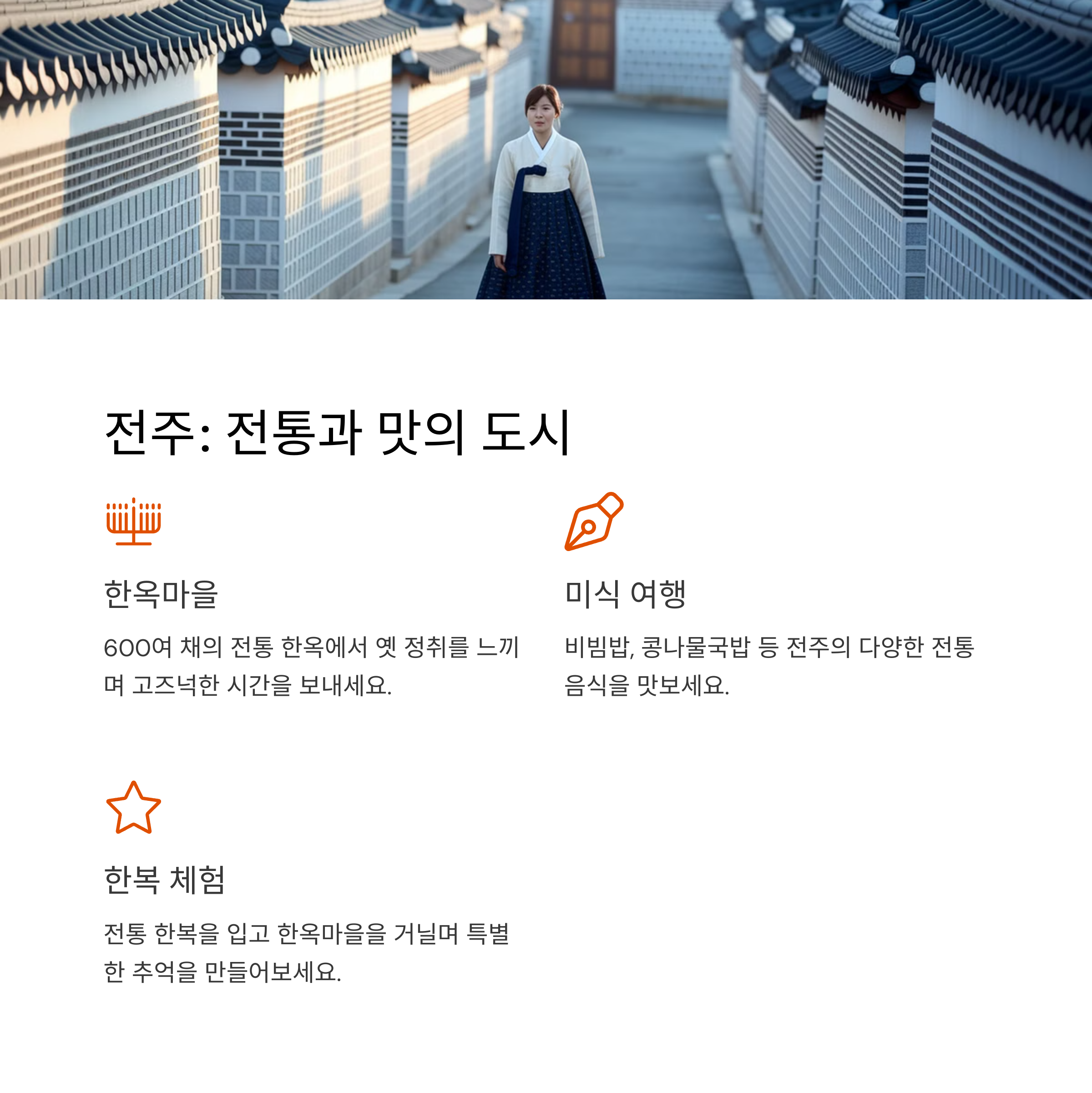 | 전주 | 한옥 체험과 미식 여행 | 전주 한옥마을, 남부시장 |