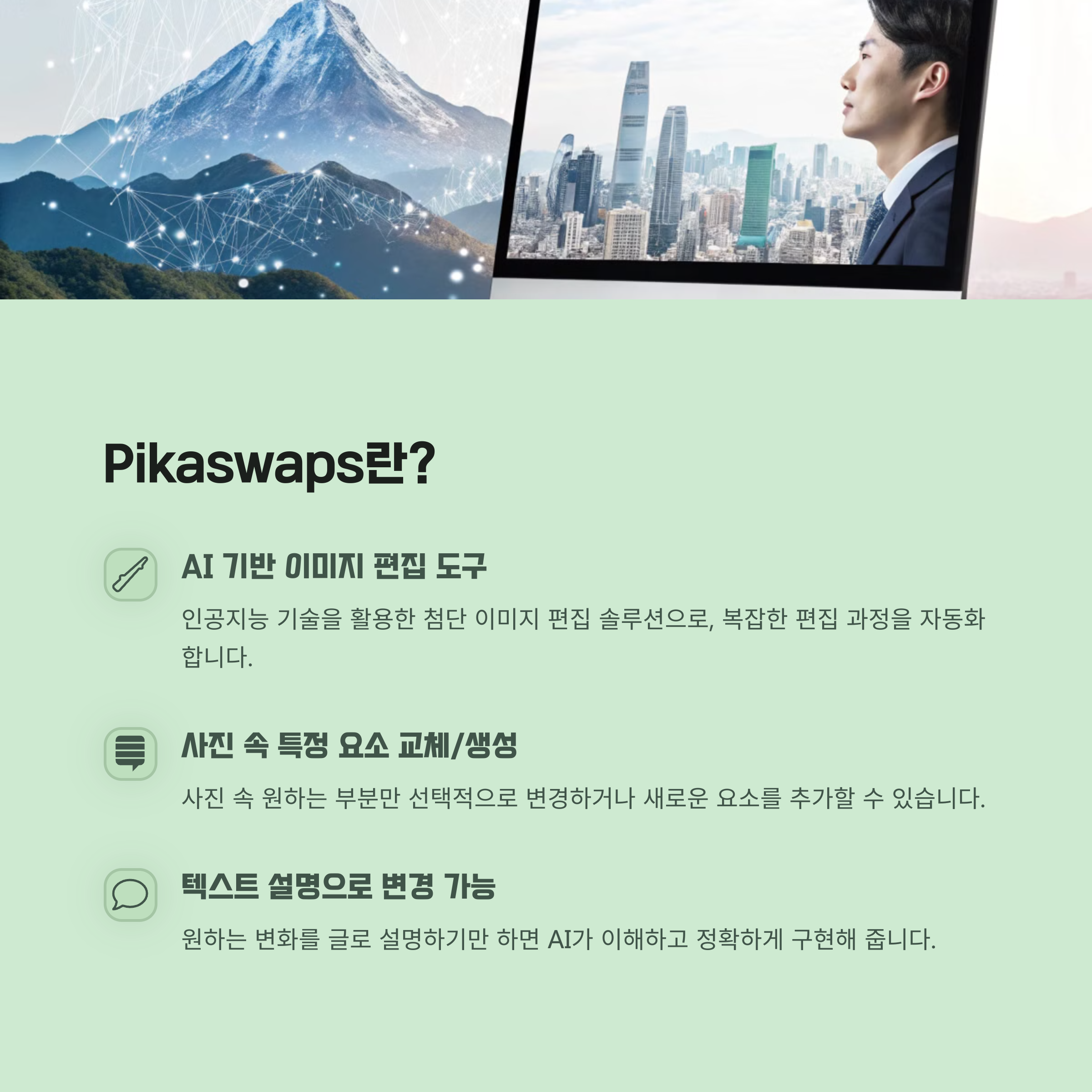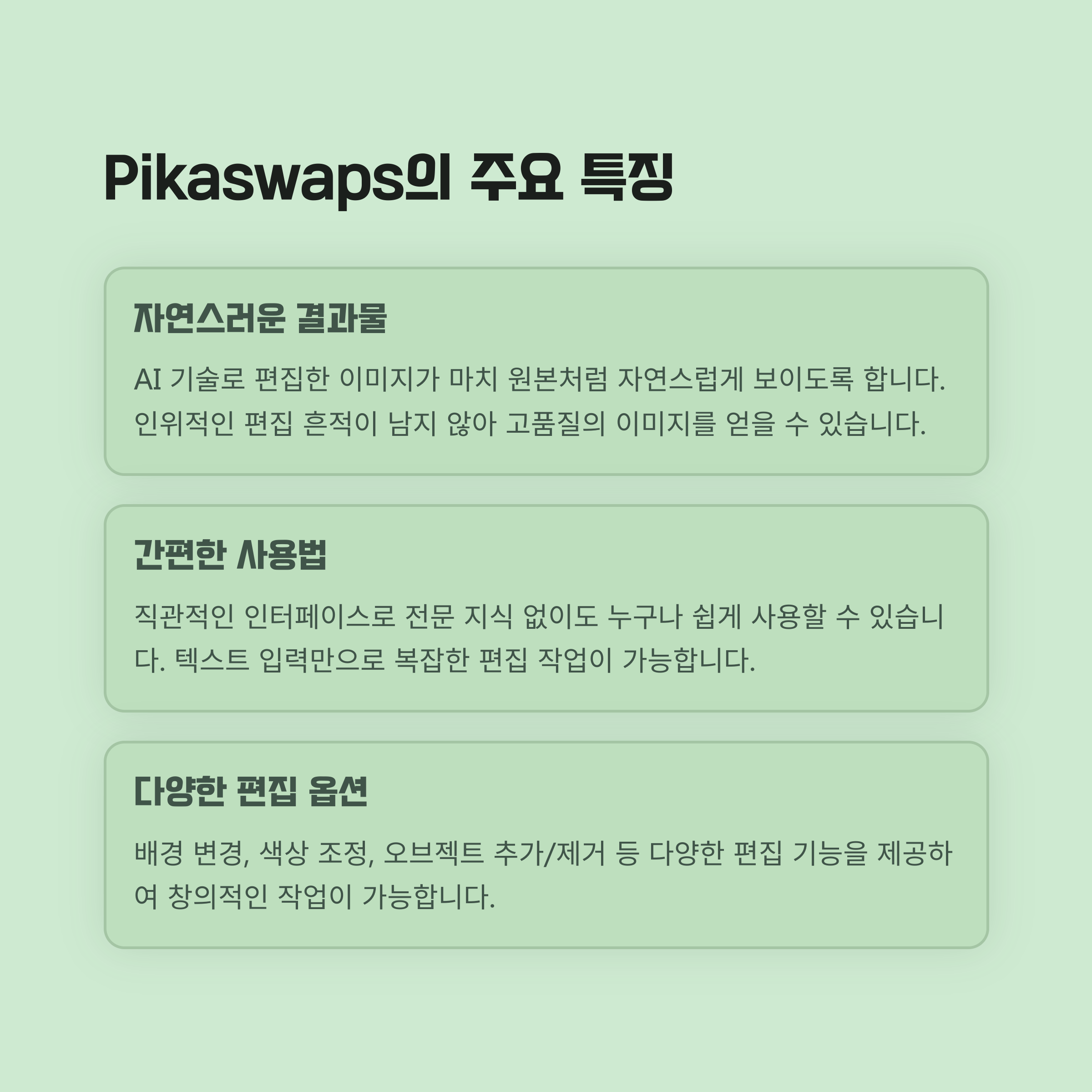 Pikaswaps는 지금까지의 이미지 편집 도구와 완전히 다른 차원의 결과를 제공합니다.