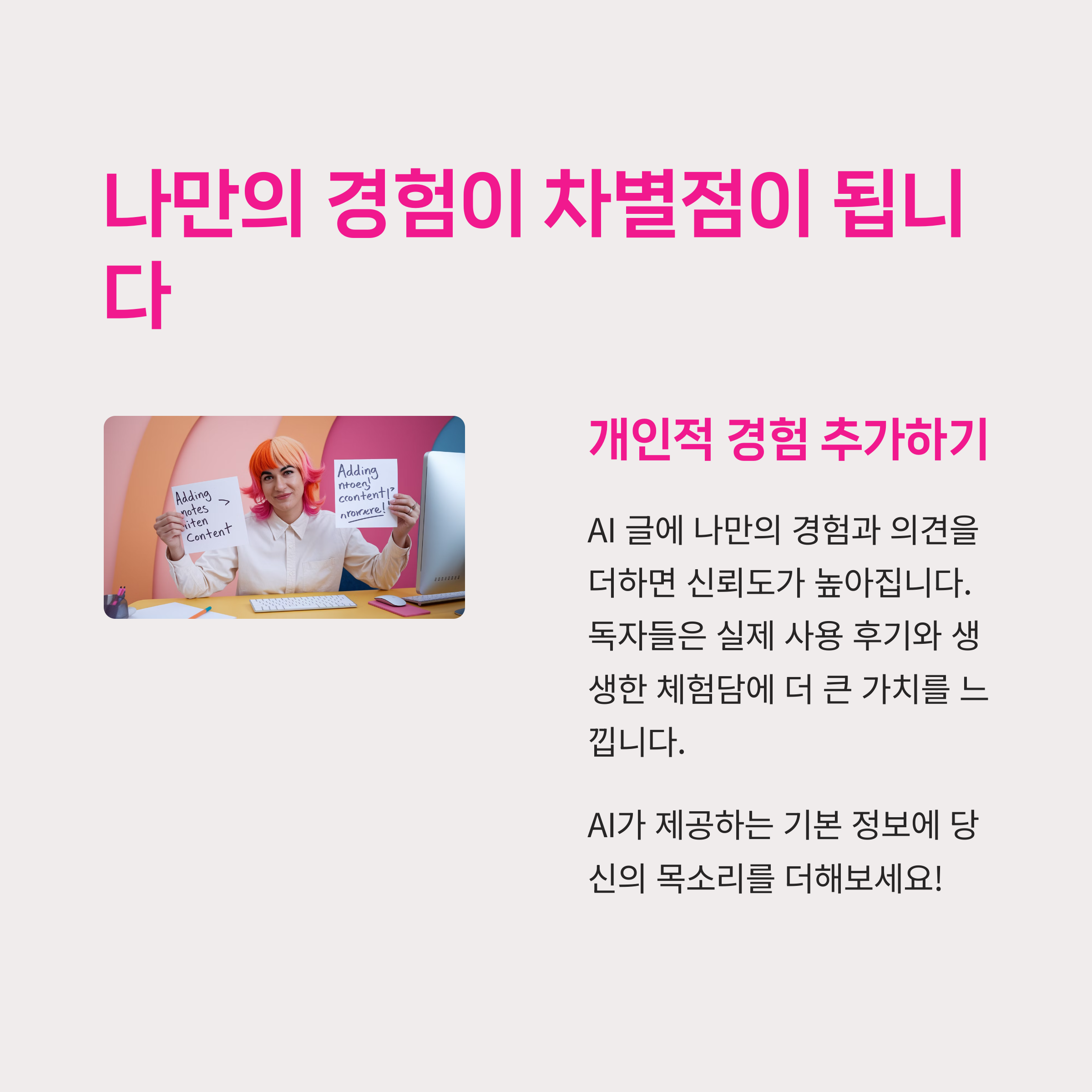 - 본문에 개인 경험, 의견, 예시 등을 첨가하여 고유성 강화하기