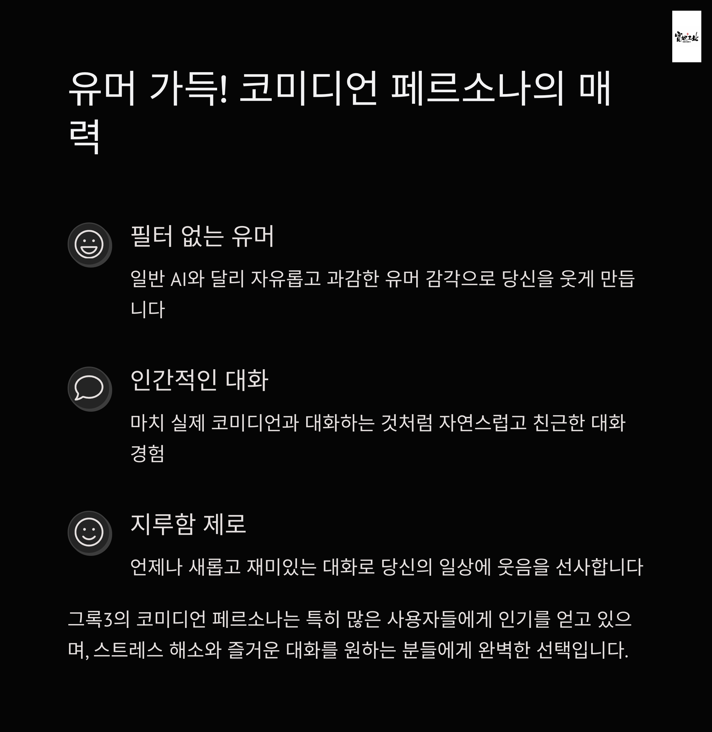 | 코미디언 페르소나는 필터 없는 유머와 풍자적 대화로 차별화됩니다. 유머 감각이 강하게 반영되어 독창적이고 기발한 대화 경험을 제공합니다. 다른 캐릭터들이 역할 중심인 반면, 코미디언 페르소나는 감정적 리프레시에 초점을 맞춥니다. 인간적 매력으로 사용자와 소통하며 재미와 즐거움을 극대화합니다. 이 페르소나는 특히 유머를 통해 피로감을 줄이고 긍정적 분위기를 조성합니다. |